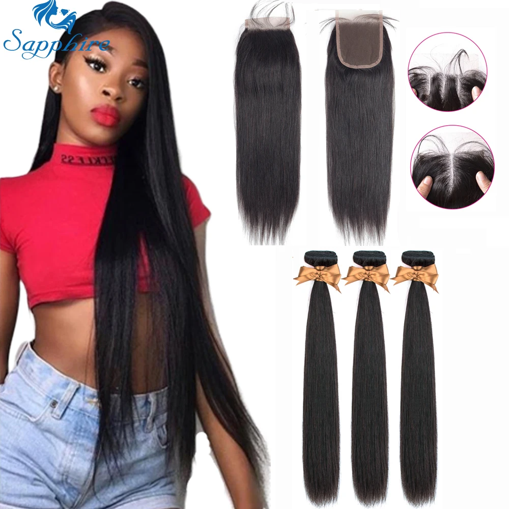 Sapphire Straight Hair Bundles with Closure Peruvian Hair 3pcs nonRemy Hair Extension Human Hair Bundles With Closure